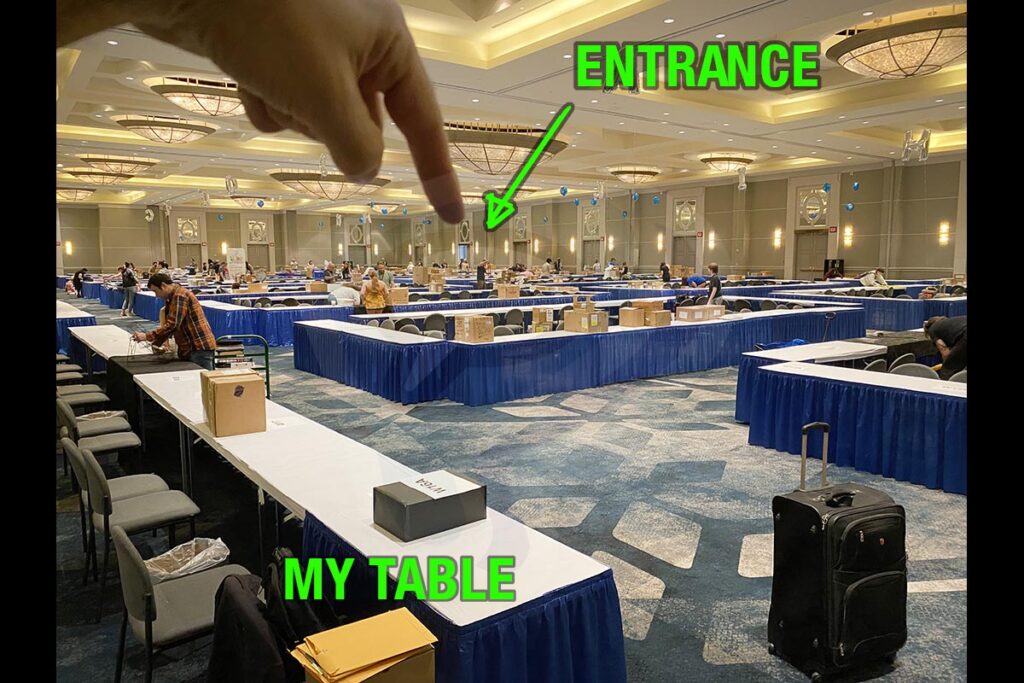 More room, you say? Done and done! Clever / sneaky me, I maximized the freedom of my far-back-corner spot and extended my half-table to a three-quarter-table; all it took was a suitcase under the tablecloth!